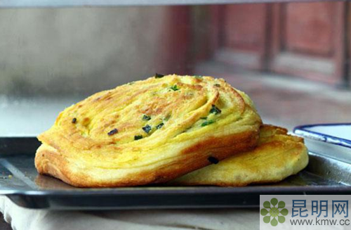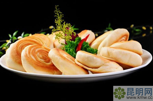 大理喜洲粑粑又名破酥,是一種色、香、味俱佳的面麥燒餅。面粉加適量的堿揉透,再加精油分層,撒上蔥花、花椒、食鹽為咸味;加火腿、肉丁、油渣、紅糖包心為甜味。放在圓形砧板上,再用油刷在餅子朝上的一面刷上一層香油,然后放入鍋中烘烤。烤出來的喜洲粑粑不僅色美味香,而且廉價(jià)實(shí)惠。