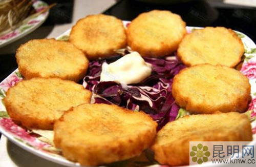 這是昆明著名的小吃。一種用面粉、玉米或糯米、豬油、芝麻、肉丁等制作而成的食品。“摩登”源于法語,為時(shí)髦,昆明人當(dāng)作漂亮的意思。創(chuàng)造者原是昆明綏靖路年輕漂亮的姐妹倆,摩登粑粑表皮酥脆、內(nèi)里柔軟易嚼、口感甜而不膩,兼有奶油的鮮香。